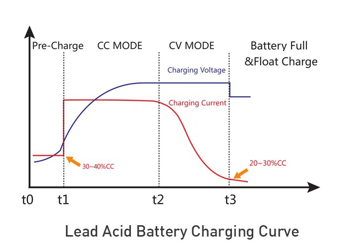 Charging mode 5 stages: Pre-charge, CC mode, CV mode, battery full and float charge
